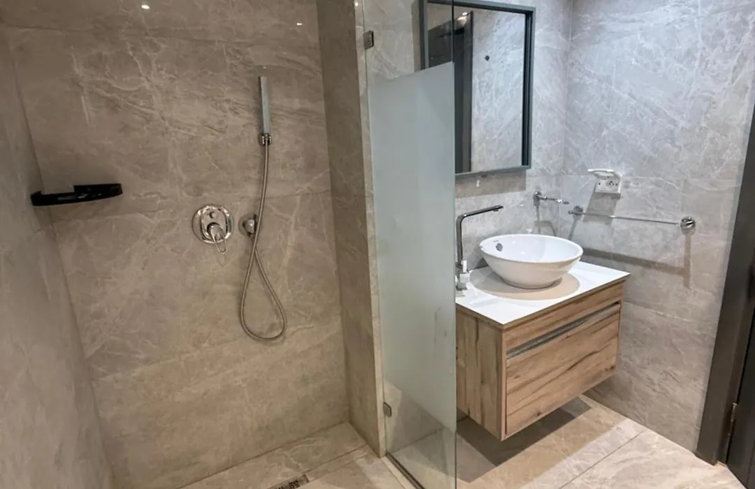 The apartment overlooks the garden and comprises a balcony, a terrace, and a dressing area with climate control and a washing machine. The accommodation features a bathroom with hair dryers, toiletries, and bath sheets. Moreover, there is a separate toilet and a shower as well.